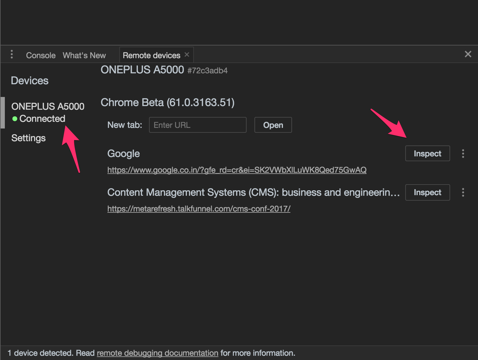 Click vào tên thiết bị ở máy tính, nó sẽ hiển thị tất cả các tabs mà bạn đang mở trên thiết bị Android. Click vào Inspect ở tab mà bạn muốn check.