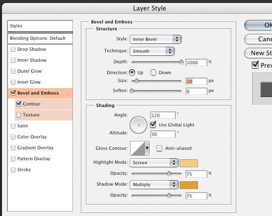 Trước hết hãy chắc rằng text layer được chọn trong Layers Panel, sau đó bấm vào biểu tượng Add a layer style ở dưới cùng của Layers Panel. Chọn Bevel and Embossi. Cài đặt như hình dưới đây để làm nổi bật các cạnh chữ. Đừng quên thay đổi màu sắc cho highlights and shadows. Highlight là # FFCC66 và shadow là # DFA125.