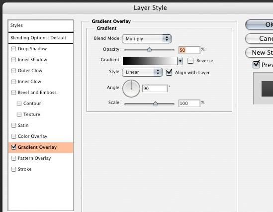 Thêm Gradient Overlay layer style vào cạnh chữ màu vàng. Các màu là đen (# 000000) và trắng (#FFFFFF) (nhấp đúp vào lớp đã hợp nhất để mở hộp thoại Layer Style