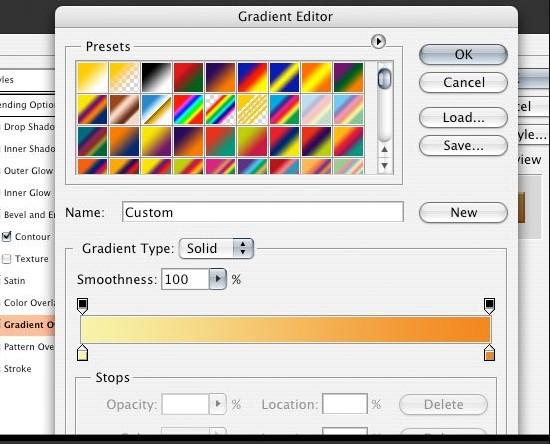 Điều cuối cùng chúng ta sẽ làm với bề mặt chữ đó là thêm Gradient Overlay layer style. Nhấp vào gradient và thay đổi điểm màu bên trái thành # F7F3A7 và điểm màu bên phải thành # F3881F.