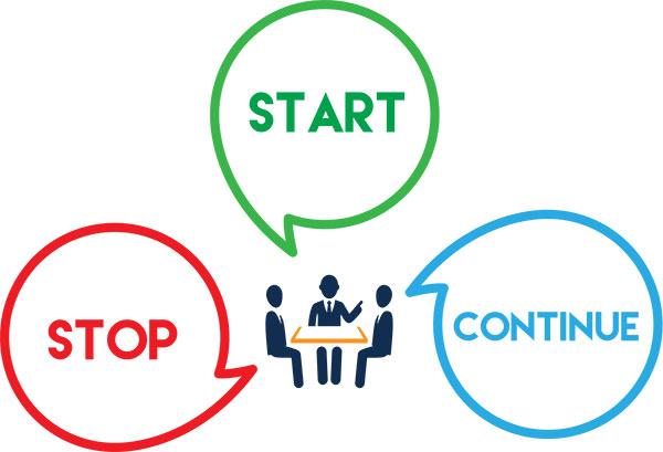 Một cuộc Start, Stop and Continue bám sát vào định hướng hành động, ít bị cảm xúc hóa. Chúng ta sẽ không hỏi các thành viên trong team cảm thấy thế nào (vui, buồn, hạnh phúc, tức giận ...). Nhiều người nói rằng điều quan trọng là phải thấu hiểu cảm xúc của các thành viên. Nhưng trong một số trường hợp điều đó chưa hẳn đã chính xác. Trong phương pháp này chúng ta cần xác định nhanh chóng những việc cần làm để giúp cho team tốt hơn.