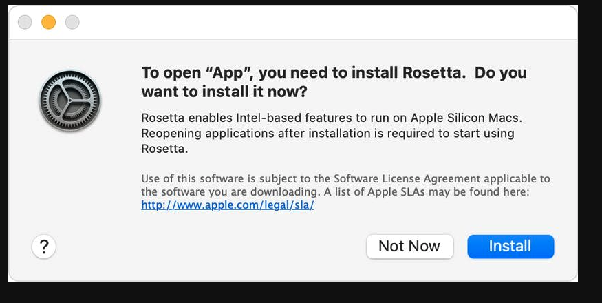 Nếu bạn đang sử dụng MacBook Pro / Air với chip silicon M1 / Apple, bạn có thể được yêu cầu cài đặt Rosetta để mở một ứng dụng.