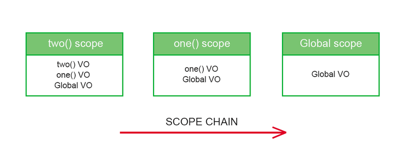 Đoạn code trên sẽ in ra kết quả là appleballcat vì hàm two() có thể truy cập tới các biến được khai báo bên ngoài nó, như vậy scope của hàm two() bao gồm các biến của chính nó và các biến được lưu trữ trong VO của one() và Global VO, sơ đồ dưới đây sẽ giúp bạn dễ hình dung hơn: