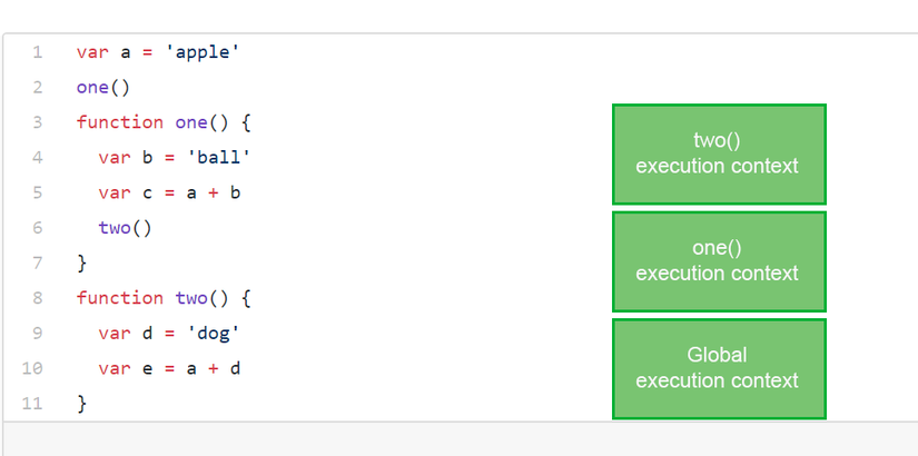 Khi các Engine gặp biến a và function one(), nó sẽ được chưa trong GEC vì nó không nằm trong bất kỳ một function nào,  khi thực thi function one(), nó tạo một EC nằm trên GEC, tiếp tục, trng function one() có 2 biến là b và c, cả 2 biến này đều nằm trong one() execution context , đến dòng thực thi function two() nó sẽ lại sinh ra một EC khác nằm trên  one() execution context . và sau khi đã thực hiện xong, các EC của one() và two() sẽ mất đi và chỉ còn lại GEC.