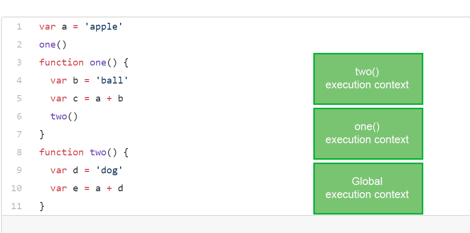 Khi các Engine gặp biến a và function one(), nó sẽ được chưa trong GEC vì nó không nằm trong bất kỳ một function nào, khi thực thi function one(), nó tạo một EC nằm trên GEC, tiếp tục, trng function one() có 2 biến là b và c, cả 2 biến này đều nằm trong one() execution context , đến dòng thực thi function two() nó sẽ lại sinh ra một EC khác nằm trên one() execution context . và sau khi đã thực hiện xong, các EC của one() và two() sẽ mất đi và chỉ còn lại GEC.