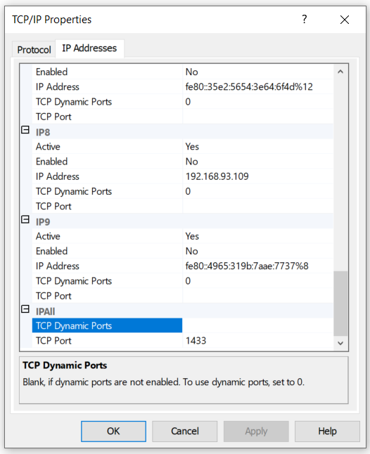 Của mình:1. Click vào TCP/IP ở hình trên hoặc click chuột phải chọn properties. 2. Popup tên TCP/IP Properties hiện lên. 3. Chọn tab: IP Addresses. 4. Kéo xuống phần: IPALL 5. Nhập: 1433 vào TCP Port 6. Nhấn OK... xong!
