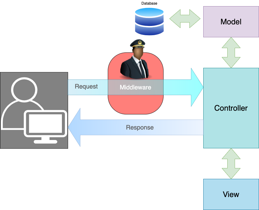 Khi client truy cập vào link thì router sẽ phải điều hướng qua Middeware để kiểm tra Request đó có đủ điều kiện truy cập vào Controller ko. Nếu đủ thì Controller sẽ xử lý request đó bằng việc tương tác với Model để lấy dữ liệu từ Database và xử lý dữ liệu đó trước khi trả ngược lại cho controller, sau đó controller đữa data cho View để đổ data xuống template , sau đó render ra HTML hoặc JSON rồi trả response cho client. - Tham khảo: