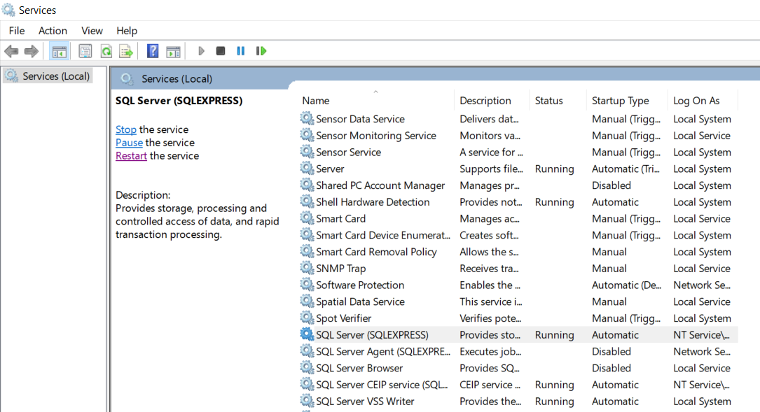 - Mở Command Prompt nhập: services.msc -> nhấn enter để mở Services -> Tìm SQL Server (SQLEXPRESS) -> Nhấn restart ở phía bên trái.