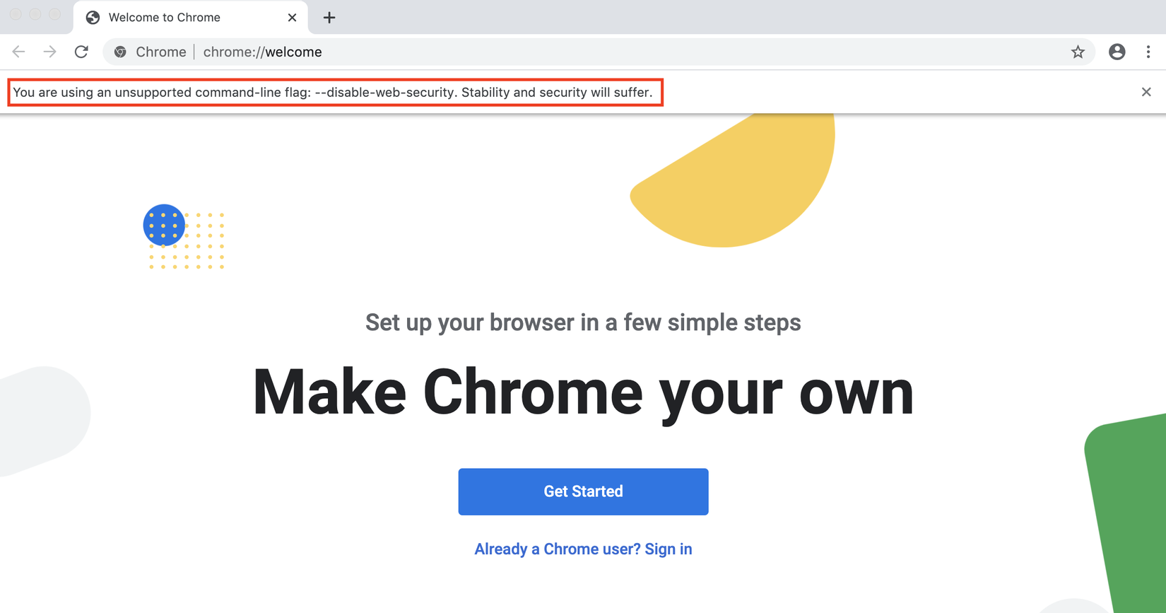 You are using an unsupported command-line flag: --disable-web-security. Stability and security will suffer.