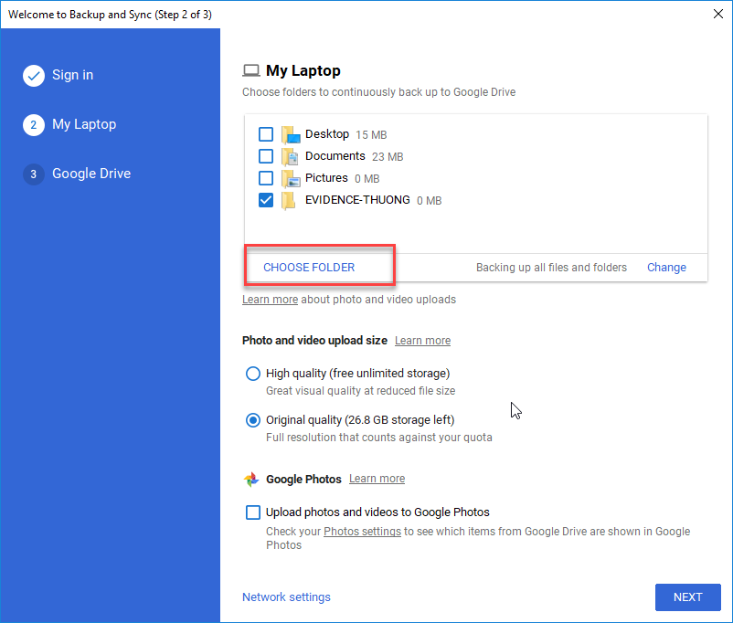 Chọn Folder muốn sao lưu (Nên tạo một folder mới dành riêng cho việc lưu trữ Evidence)