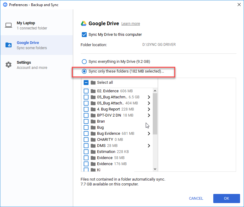 Chọn folder muốn sync (Nên chọn option thứ 2 "Sync only these folders", sau đó chỉ cần chọn folder trên My driver mà mình sẽ lưu Evidence ở danh sách folder phía dưới, lựa chọn này vừa giảm dư thừa các file không cần thiết sử dụng khi sync về máy tính)