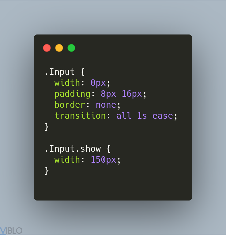 Một animation đơn giản, khi bạn bấm vào icon tìm kiếm, ô input sẽ hiện ra từ trái qua phải. Bạn có thể xem đoạn code bên dưới để biết cách mình đã làm: