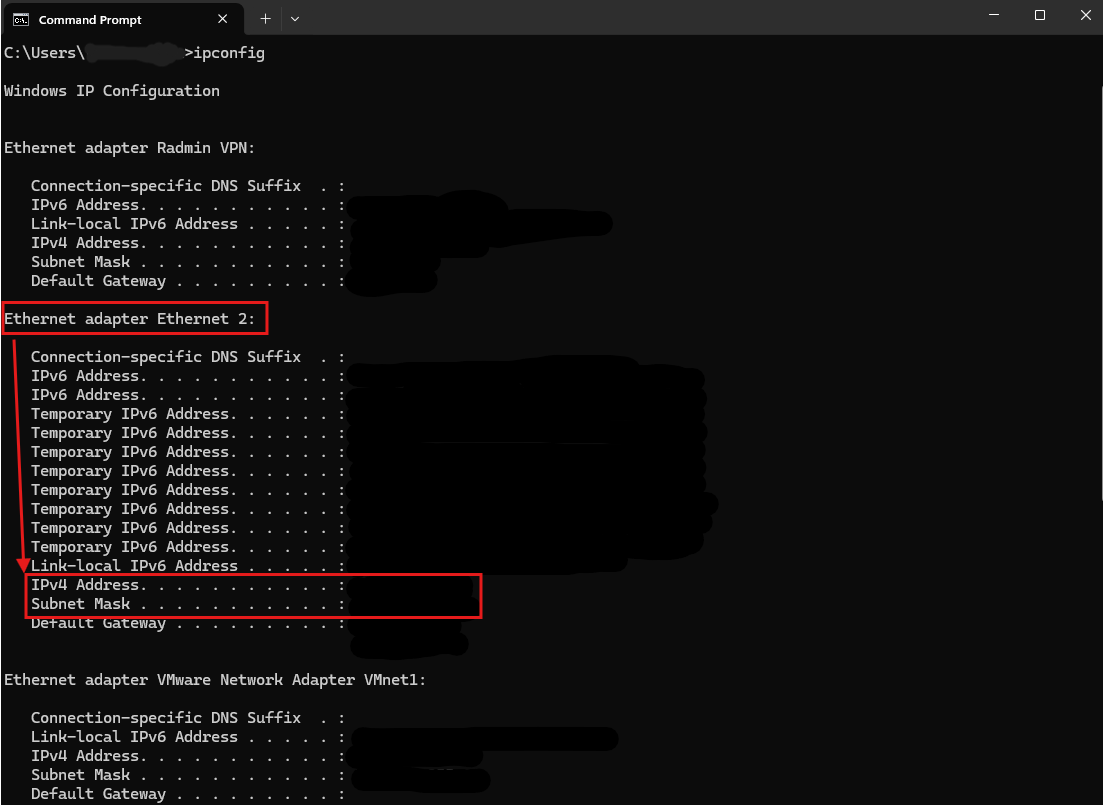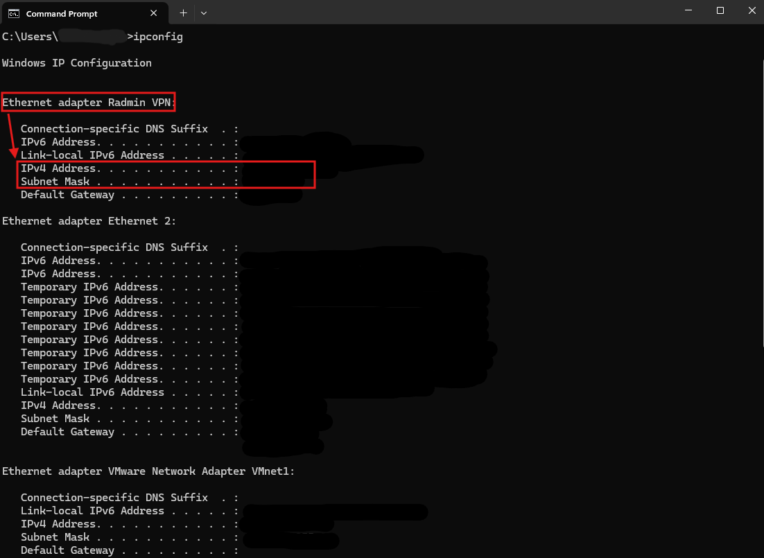 Nếu dùng các phần mềm này, IP và subnet mask của máy bạn phải lấy ở mục tương ứng, như mình dùng Radmin thì sẽ phải lấy trong mục Ethernet adapter Radmin VPN