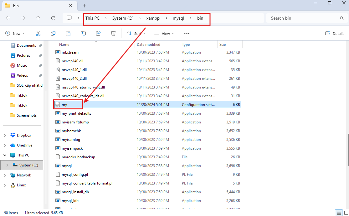Nếu dùng MySQL server thông qua xampp trên Window: C:\xampp\mysql\bin\my.ini