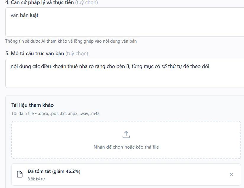 Bước 5: Sau đó ở giao diện này bạn có thể điền thêm một số nội dung gợi ý nếu cần, tải văn bản tham khảo lên để công cụ dựa theo tài liệu để tạo văn bản cho bạn.