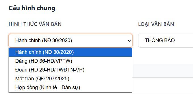 Bước 3: Chuyển sang giao diện mới, tại mục Cấu hình chung chúng ta cần chọn Hình thức văn bản sử dụng là gì trong danh sách hiển thị.