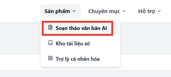 Bước 2: Sau khi bạn đã có tài khoản và kích hoạt, chúng ta truy cập vào trang web chính rồi nhấn vào Sản phẩm rồi chọn Soạn thảo văn bản AI.