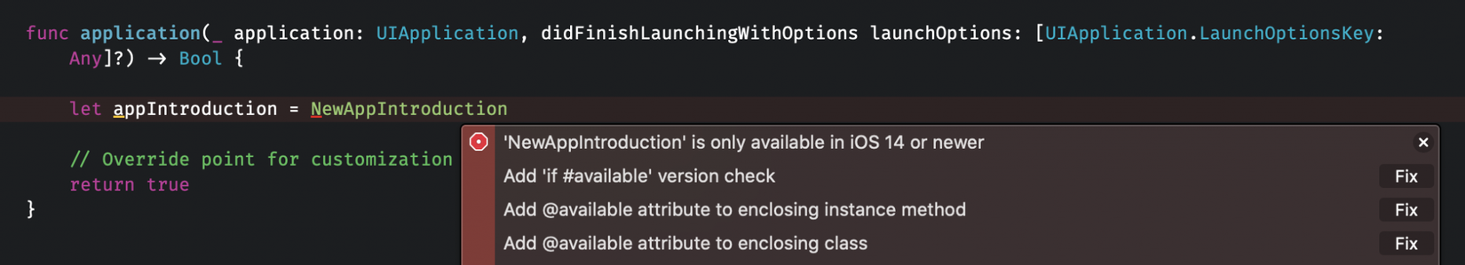 Như bạn có thể thấy, trình biên dịch sẽ giúp chúng ta khắc phục lỗi này với một số gợi ý. Hai trong số nó sẽ chuyển vấn đề sang một vị trí khác trong code của bạn bằng cách đánh dấu class gọi là khả dụng kể từ iOS 14. #available sẽ giúp chúng ta trong trường hợp này: