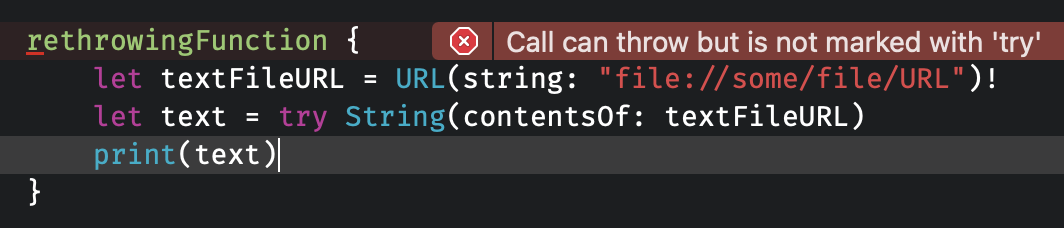 func rethrowingFunction(throwingCallback: () throws -> Void) rethrows {