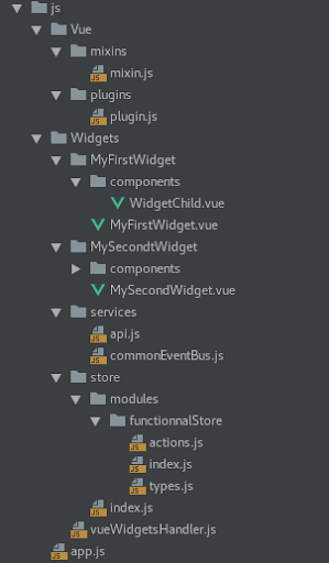 Với phương pháp này, chúng ta cần nghiêm ngặt hơn. Đây là một đề xuất về kiến trúc tệp để xử lý các widget của chúng ta và các tệp liên quan đến Vue: