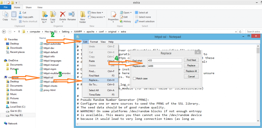 Bước 2 : Bạn click chuột phải vào File HTTPD-SSL và chọn mở bằng notepab > Click vào Edit trên thanh công cụ của Notepad >Chọn Replace một cửa sổ mới xuất hiện