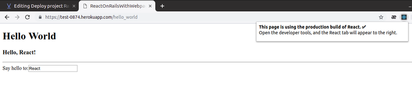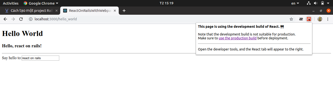 Ok, giờ thì mở trình duyệt lên và truy cập localhost:3000/hello_world để xem kết quả nhé, và đã xuất hiện dấu hiệu của react
