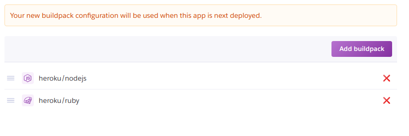 Tiếp theo chọn vào mục Setting, lăn chuột xuống phần Buildpacks và thêm buildpack như mình: