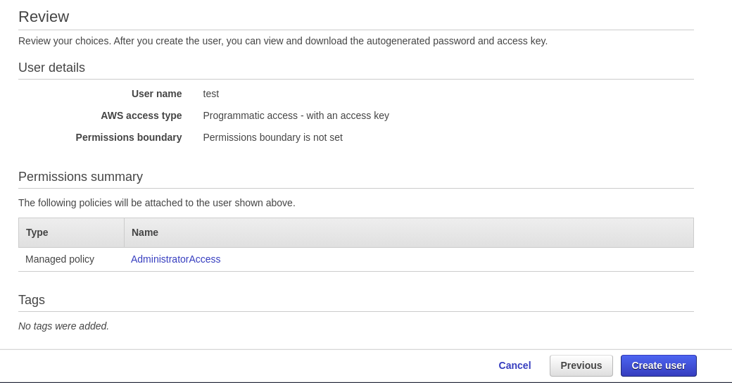 - Trong trang review, kiểm tra lại thông tin và nhấn create user.