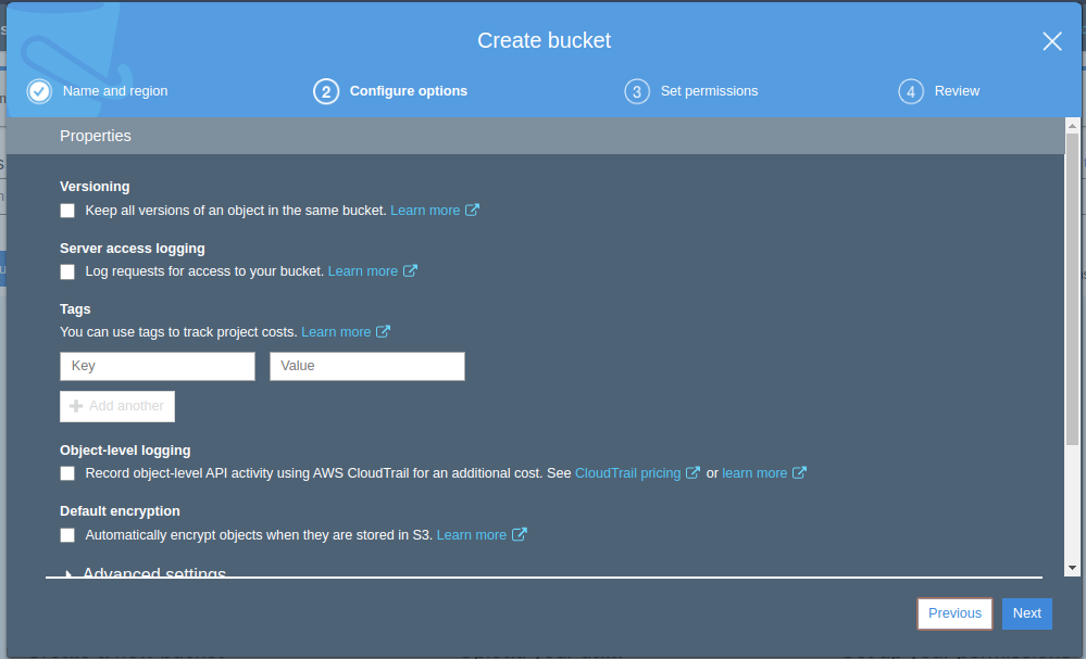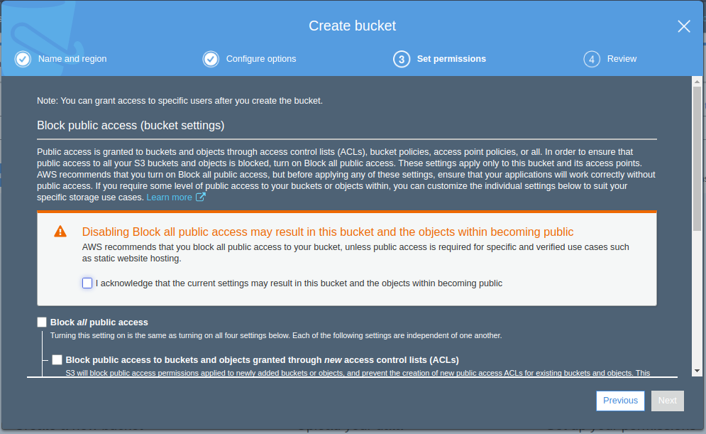 Tiếp theo đặt Permissions cho bucket. Nếu bạn không muốn thay đổi gì có thể bấm Next.