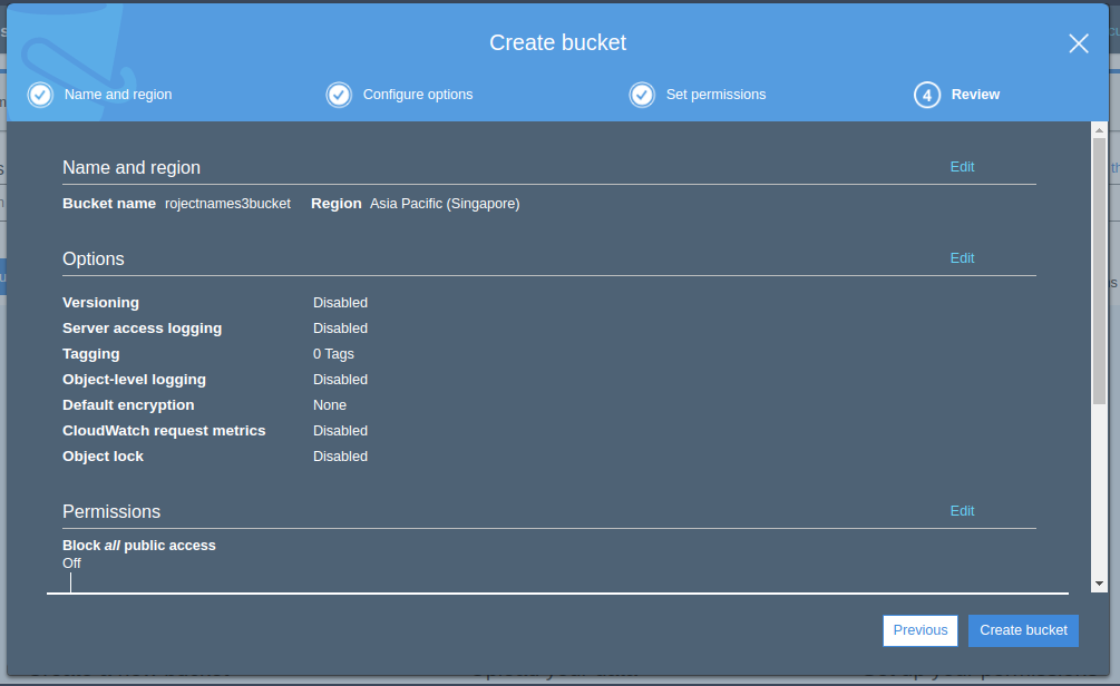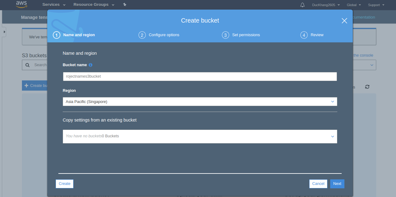 và sau đó tạo một S3 Bucket của bạn. Bạn có thể đưa ra bất kỳ tên nào có sẵn. Tên S3 là global và bạn không thể sử dụng tên đã được sử dụng bởi bất kỳ ai khác.Ví dụ, bạn có thể tạo một cái có tên dự án của bạn tương tự. projectnameS3bucket.
