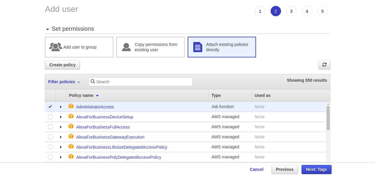 - Trong trang tiếp theo chọn Attach Existing Policy và gắn thêm tag.