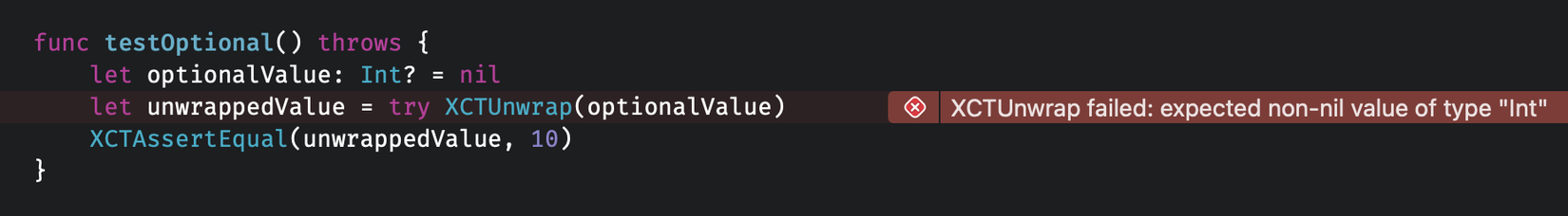 XCTUnwrap là một phương thức có sẵn trong framework XCTest để unwrap các optional trong unit test. Bất cứ khi nào một unwrap không thành công vì thiếu giá trị, nó sẽ trả ra một lỗi và unit test thất bại. Một ví dụ như sau: