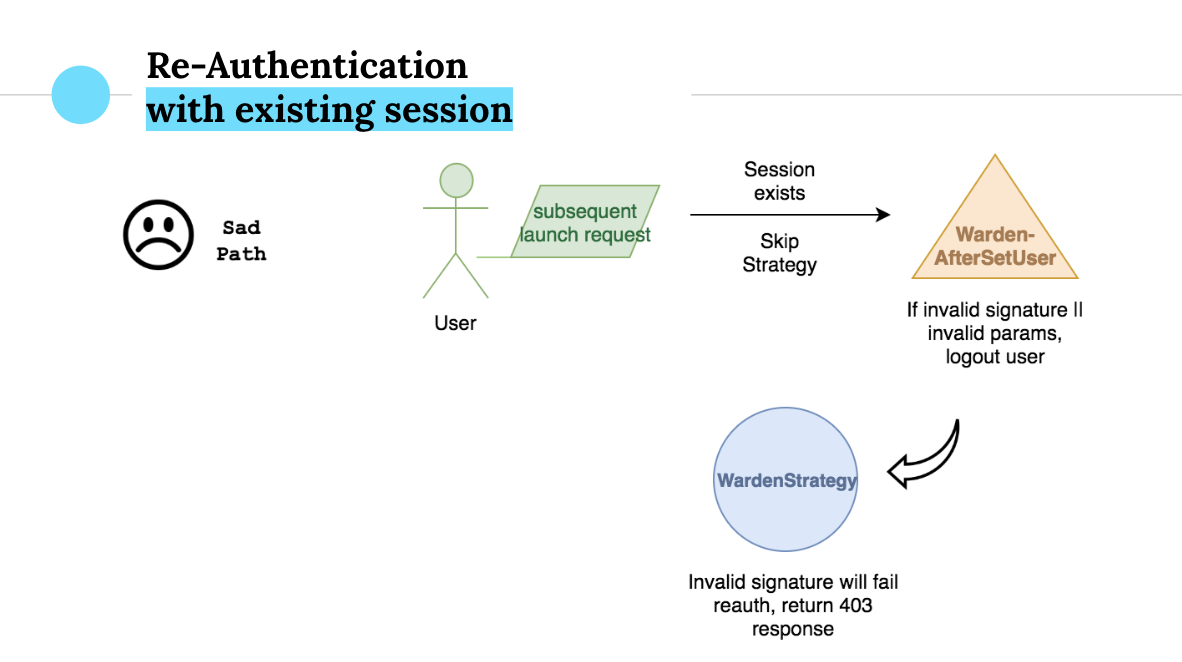 User gửi các request tiếp theo. Request bỏ qua Warden strategy và một user được set dựa vào session data sẵn có. Sau khi kích hoạt set user, khi OAuth signature không hợp lệ user đó sẽ logout session. Sau khi logout Warden strategy sẽ kích hoạt và fail do signature không hợp lệ và cuối cùng trả về 403.