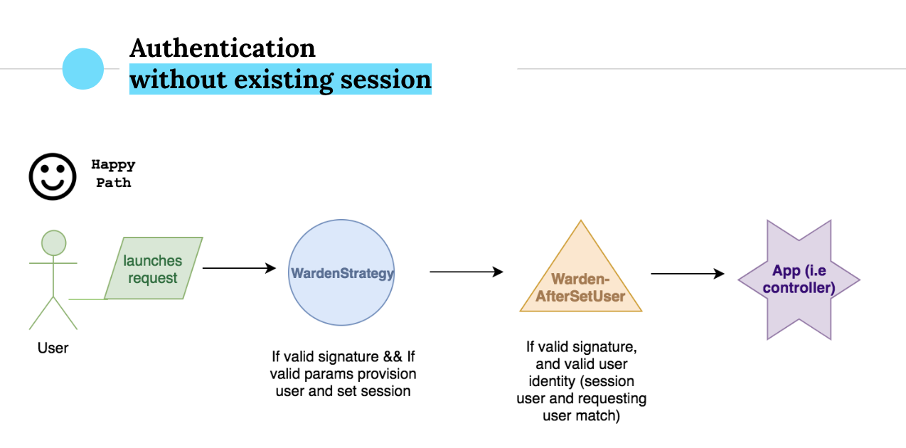 User gửi một request với signature và user params hợp lệ. Request vào đến Warden strategy và thông tin đăng nhập được xác thực, thiết lập người dùng. Sau khi thiết lập user kích hoạt và tất cả các kiểm tra về thông tin user vượt qua, cho phép request đi đến controller.