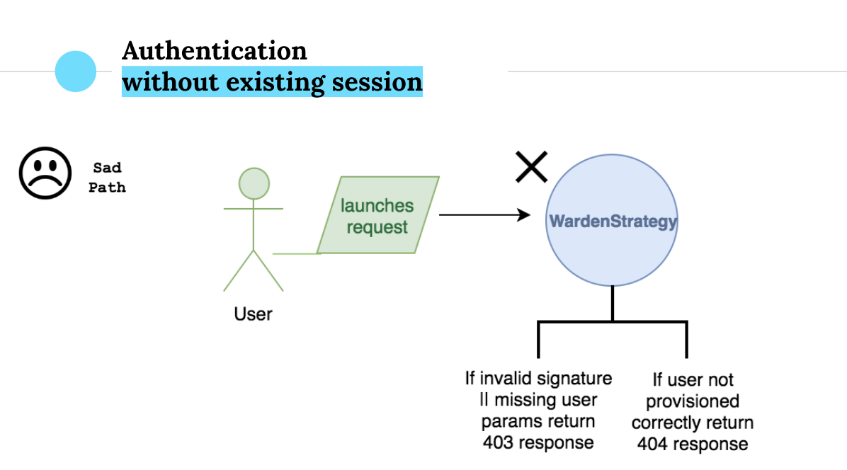 User gửi một request với signature không hợp lệ hoặc không có/ không hợp lệ params. Request đi đến Warden strategy và validate thất bại. Lỗi phản hồi sẽ gửi lại cho client mà không đi tới ứng dụng.