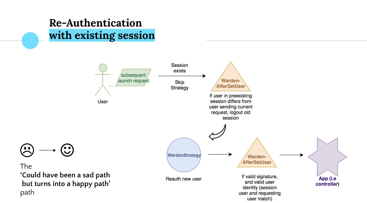 User gửi các request tiếp theo. Request bỏ qua Warden strategy và một user được set dựa vào session data sẵn có. Sau khi kích hoạt set user, khi OAuth signature hợp lệ nhưng session user và yêu cầu user khác, session user logout. Sau khi logout Warden Strategy được kích hoạt, signature hợp lệ và yêu cầu user được set user mới, khi thành công Warden Strategy After Set User và đi tới ứng dụng.