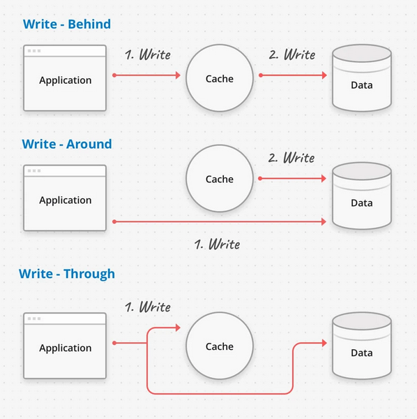 - Write-behind: Application sẽ update vào cache trước, sau đó mới update data vào DB. Cách này là cách handle những ứng dụng có lượng write lớn và cho phép rủi ro liên quan tới tính toàn vẹn dữ liệu (kiểu các hệ thống counter, analytic, tracking,...) do data có thể mất mát khi chưa được lưu vào DB. Tuy nhiên đây là loại có action write nhanh nhất.