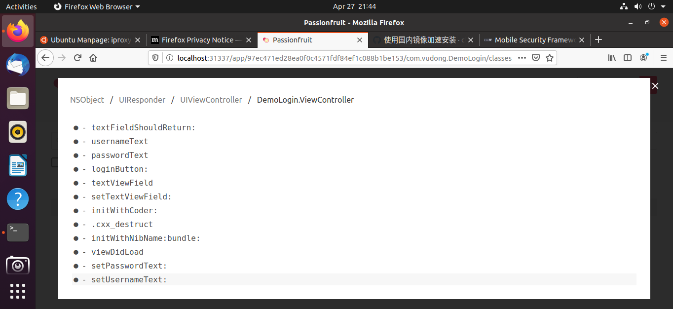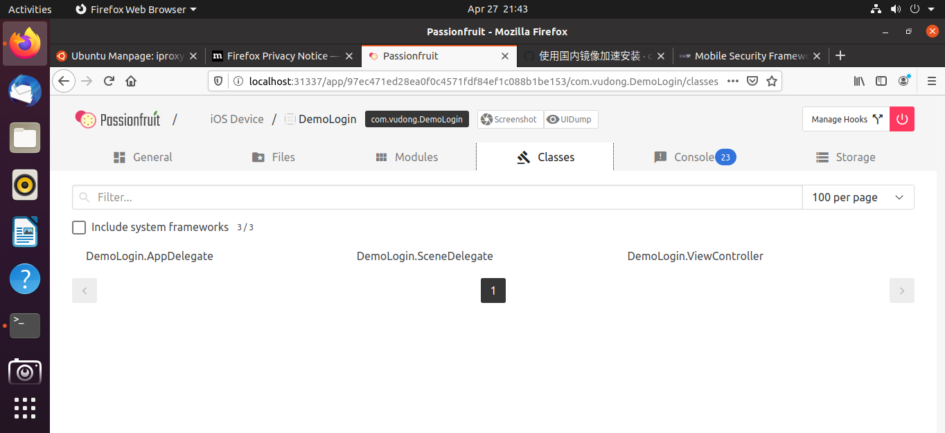 Bạn có thể sử dụng nhiều cách để xem các class của app như class-dump, class-dump-z (2 công cụ này hiện tại chỉ support thiết bị 32-bit nên rất hạn chế), frida,.... Tuy nhiên, passionfruit cũng hỗ trợ cơ bản nhất cho việc này tại tab Classes: