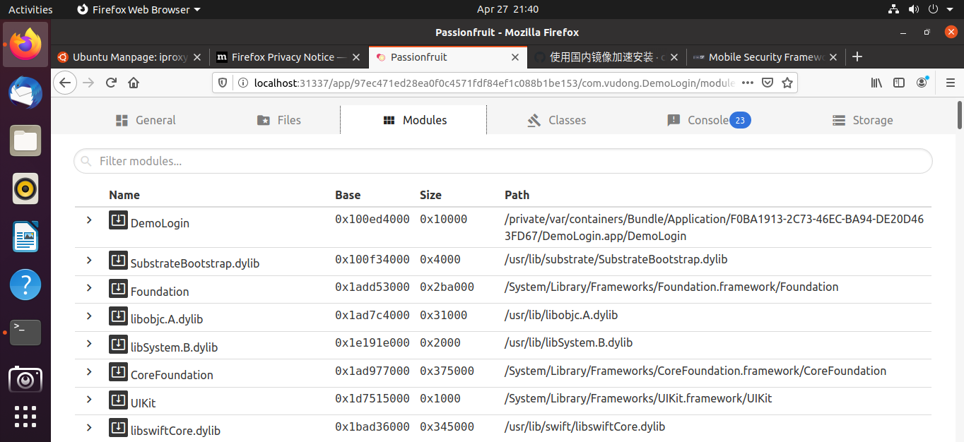 Các thư viện mà app sử dụng sẽ được lưu tại /Frameworks trong app bundle. Bạn có thể dễ dàng xem chúng bằng passionfruit tại tab Module: