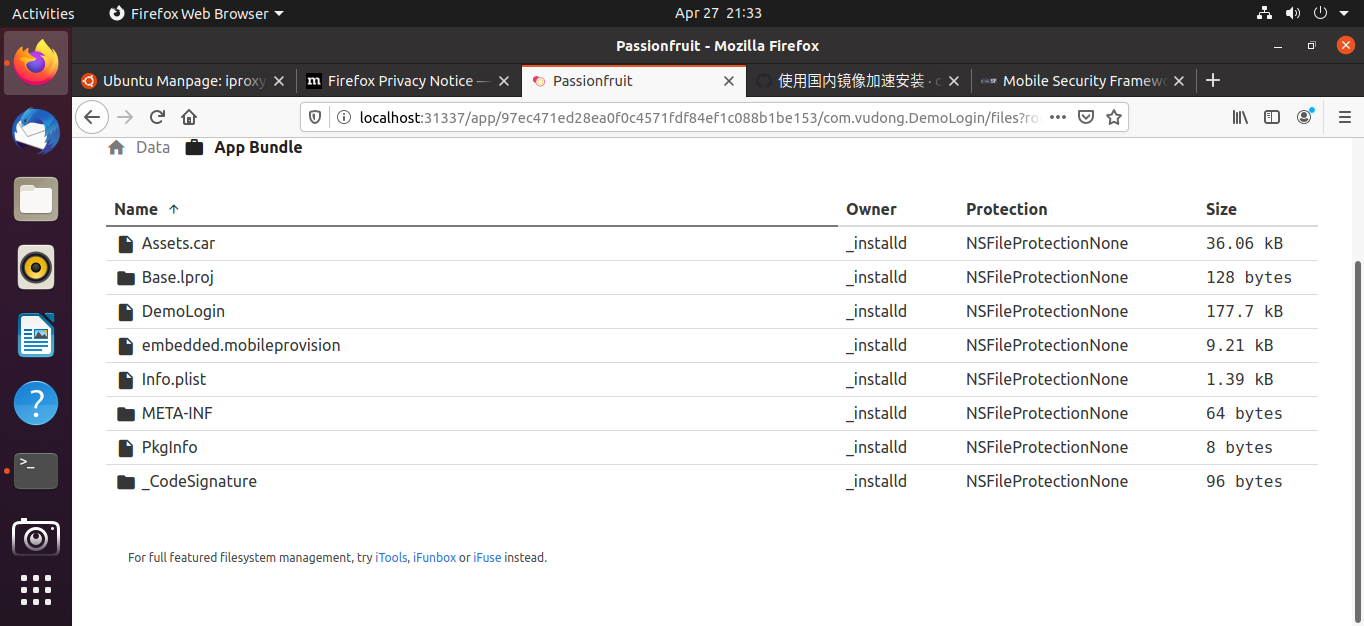 Passionfruit cho phép ta có thể xem các thông tin về app bao gồm cả các file trong bundle của app đó. Giao diện passionfruit tại app bundle sẽ như thế này: