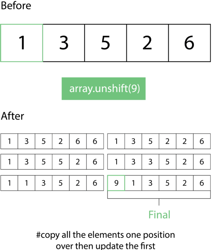 Từ điều này, chúng ta có thể thấy rằng chúng ta phải thực hiện sáu thao tác để thêm một phần tử vào phía trước của mảng. Hãy tưởng tượng nếu có một triệu phần tử trong mảng, điều đó sẽ nhanh chóng biến thành một triệu thao tác. Điều này cũng xảy ra tượng tự khi bạn muốn xóa 1 phần tử khỏi đầu mảng.