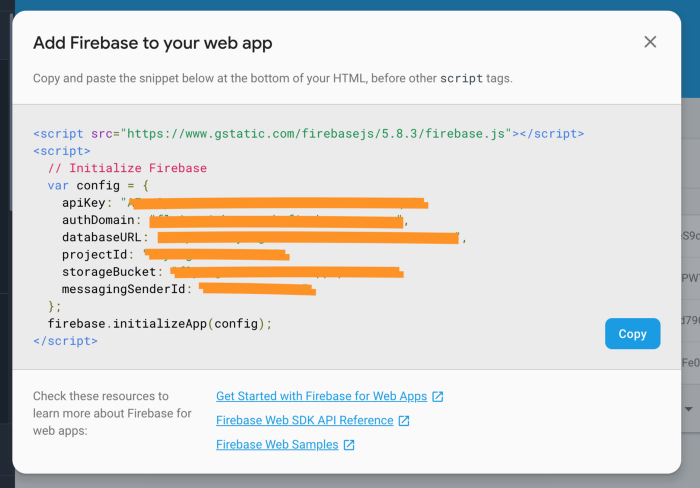 Coppy phần Config và dán vào file firebaseConfig.js, hãy nhớ export nó ra nhé. File của bạn sẽ có dạng như sau: