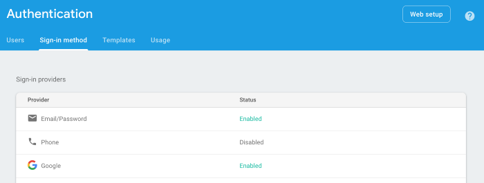 Chọn 'Sign-in method' tab và hãy chắc chắn bạn kích hoạt Google trong mục provider.