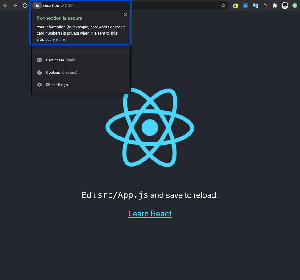 Khi bạn chạy npm start lại, bạn sẽ thấy kết nối của bạn đã được bảo mật và sử dụng https ở localhost như hình bên dưới