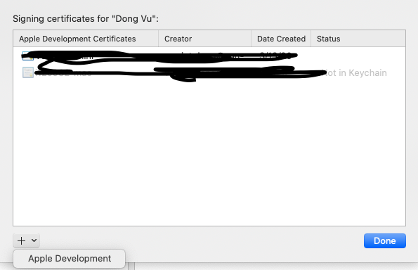 Chọn vào Management Certificate, bấm + và chọn Apple Development hoặc iOS Development