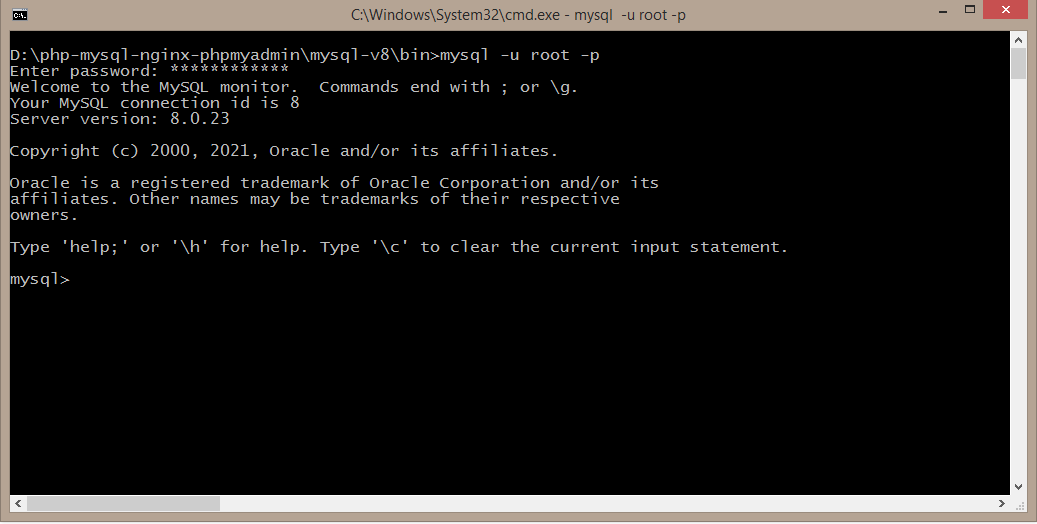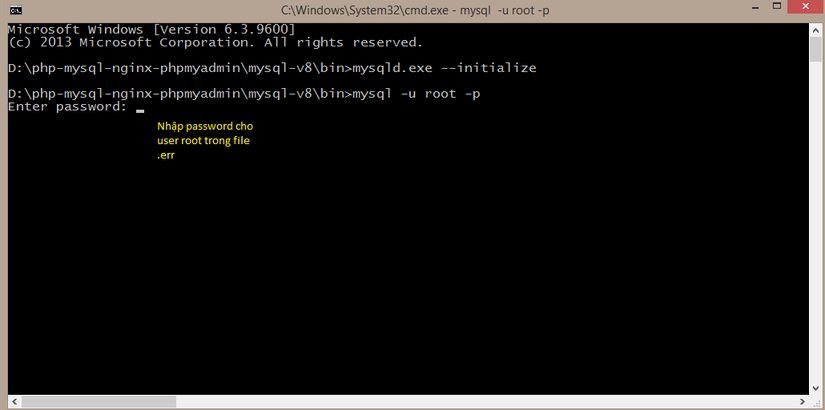 mysql -u root -pnhấn enter và nhập password mặc ở step 2