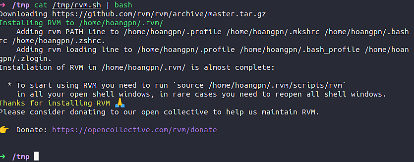 Chú ý, sau khi cài đặt xong chúng ta cần chạy câu lệnh source /home/hoangpn/.rvm/scripts/rvm → Ghi tương ứng ở ảnh trên nhé (do mỗi máy sẽ có các đường dẫn khác nhau.)