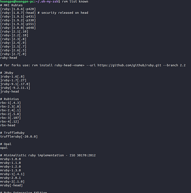 Để kiểm tra các phiên bản ruby mà rvm hỗ trợ, chúng ta chạy câu lệnh trên nhé