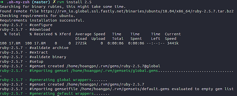Hoặc chúng ta có thể chạy câu lệnh sau để install rvm + ruby bản mới nhất luôn nhé
