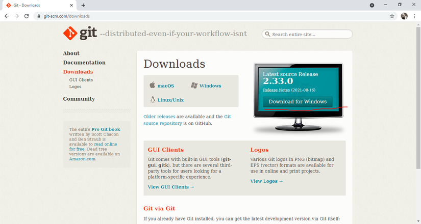 Để cài đặt Git trên Windows 10, các bạn truy cập url https://git-scm.com/ và chọn Download for Windows như hình: